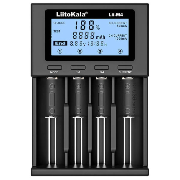 LiitoKala Lii-M4 - це інтелектуальний універсальний зарядний пристрій, який може заряджати та розряджати практично всі Li-ion, Ni-MH, NiCd акумулятори. Він також має функцію перевірки ємності акумулятора.