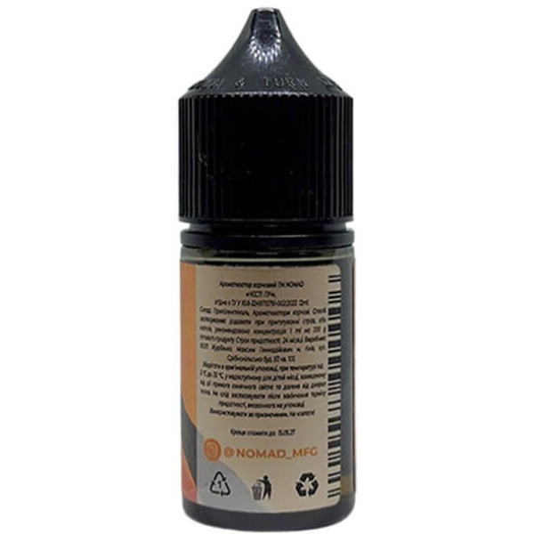На сайті продається аромка, яка ідеально підходить для літа і для гарного настрою. Це вдале поєднання чорного чаю і стиглого персика. Nomad - Nasty Peach 12 ml подобається досвідченим вейперам і новачкам. Для приготування рідини потрібно додати у флакон нікотин, гліцерин і трохи почекати. Через пару годин рідина буде готова. Чорний чай і освіжаюча фруктова нотка - те, що потрібно!